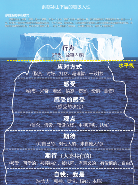 这就是就是萨提亚的冰山理论,实际上是一个隐喻,它指一个人的“自我”就像一座冰山一样,我们能看到的只是表面很少的一部分——行为,而更大一部分的内在世界却藏在更深层次,不为人所见,恰如冰山。营销策划师需要做的工作往往是透过消费者的表面行为,去探索消费者的内在冰山,从中寻找出解决之道——每个人都有自己的冰山,认识到自己的冰山,你的人生就会改变! 维琴尼亚•萨提亚(Virginia Satir)是美国最具影响力的首席心理治疗大师一位女士的名字,也代表以维琴尼亚·萨提亚名字命名的一种成长模式。 根据萨提亚的理论,一个人和他的原生家庭有着千丝万缕的联系,这种联系有可能影响他的一生。一个人和他的经历有着难以割断的联系,我们不快乐的根源可能是因为儿时未被满足的期待。 我们同样认为,消费者所处的社会环境跟消费者心理有着千丝万缕的联系,消费者一切的行为都可以用原始社会中的需求所解释。 萨提亚用了一个非常形象的比喻:这就像一座漂浮在水面上的巨大冰山,能够被外界看到的行为表现或应对方式,只是露在水面上很小的一部分,大约只有八分之一露出水面,另外的八分之七藏在水底。 而暗涌在水面之下更大的山体,则是长期压抑并被我们忽略的“内在”。揭开冰山的秘密,我们会看到生命中的渴望、期待、观点和感受,看到真正的自我。 萨提亚模式中的个人冰山理论的隐喻: 1、行为----应对模式(行动、故事内容)2、应对方式-----(姿态)3、对感受的感受---自我价值:感受(喜悦、兴奋、着迷、愤怒、伤害、恐惧、忧伤,,悲伤等等 ); 感受的感受(关于感受的决定)4、观点---信念,假设,主观现实,思考,想法,价值观(信念、假设、预设立场、主观现实、认知)5、期待---对自己,对别人,来自他人的期待(对自己的、对他人的,来自他人的)6、渴望----爱,接纳,归属,创意,连结,自由等等(人类共有的:被爱、被认可、被接纳、被认可、有目的的、意义、自由)7、自己:我是谁---------灵性,灵魂,生命能量,精髓,核心,存在(生命力、精神、灵性、核心、本质) 一般来说,我们看见都只是冰山一角,那就是外在行为的呈现。但在下面蕴藏着情绪,感受,期待,渴望等。往往我们在与人沟通时,并没有去体会和察觉沟通下面的冰山。有时甚至连自己对自己冰山下面的东西也没有觉察。 基于萨提亚冰山理论的探究和引用-----观速超级人性冰山理论 我们认为在消费者的行为和应对方式的表象下面,依次有“感受”、“感受的感受(为什么有这种感受)”、“观点”、“期待”、“渴望”、“自己(我需要什么)”的根源问题。而一个消费者之所以感受到接受品牌及使用产品的体验不好就是他们没有能够一致性地表达自己。就是说这七个因素中的某个和某些因素之间产生了混乱,所以就产生了“消费的不和谐性”。 消费者的意识和潜意识也是用冰山来比喻的,认为消费者的意识是被潜意识左右的;管理学中也有冰山理论,它认为浮在表面的问题的背后都有更深的问题需要挖掘。但是萨提亚冰山的独到之处是它把这些根源问题又给细分了,它很清晰地描述出产生每个问题的较深层问题,如同是楼梯一样,它能让你沿着这楼梯找到你问题的答案。当然走这些楼梯的步骤也灵活的,我们每个人可以根据自己的情况决定是迈一步还是几步。这点又让我想起管理学中的“六次追问”,用六次的追问来发现问题的根源。原来学问是如此的互通,他们应该有共同的根源,这就是“营销哲学”。宇宙中的这种“共性”在萨提亚冰山理论的“渴望”里也有深刻的表述:人的渴望是共有的,例如被爱、被接纳、被认可、有目的的、有意义、自由的等等。也就是说在本质上人们共同的部分很多,但是表现出来的差异却很大。如同是水,加点酒精就是酒、加点糖精就是糖水、加点醋精就是醋……。这种本质上的共性是我们理解消费者的基础,也是萨提亚对人性研究的基础。观速在萨提亚人性研究的理论基础上,结合营销范畴,提炼出了“超级人性冰山理论”。超级人性冰山包含两大内容:超级人性符号,超级人性话语。 “观速超级人性冰山方法”应用的方法很简单,就是用7张纸依次写下那些根源问题。然后依次摆在地上,先让策划师以消费者的角度站在“个人行为”上,做必要的放松后让他清晰地感觉到目前困绕自己的商业问题(比如我目前最需要什么?我需要看到什么?我有什么问题?);让他走到“感受”上,问他这样做有什么感受;达到目的后再让他走到“感受的感受”上,问他为什么会产生这样的感受;……。步骤不是固定的,但是最终要走到“自己”上。这个过程的精妙之处是能让消费者在了解到问题产生的根源,然后根据消费者到底需要什么做出选择。当然在实战中,往往需要真实的一大批的消费者真正参与进来。 观速人性冰山理论的消费者的应对姿态 研究消费者现在对超级符号及超级话语的认知,就要研究消费者的普遍记忆。我们在研究消费者的理论中,更多还是在萨提亚理论研究人性的基础上做了改良和升华。使其更加适合现代商品竞争中消费者的人性需求。在研究消费者的记忆中,一般会先撇开商品和消费行为不看,简单测试一下人的基本行为,然后去跟商品建立联系,从而创作出,人人都有共鸣,人人都去传播的超级符号(设计)及超级话语(Slogan 沟通语言)。 “消费者普